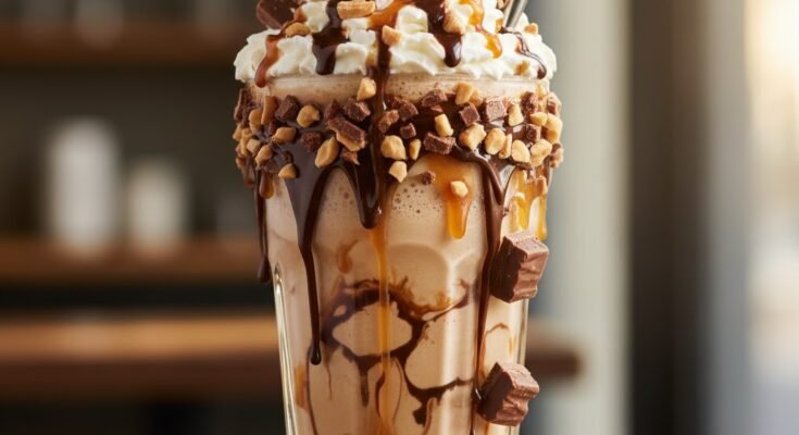 - Serve and Decorate: Pour the shake into a glass. Top it with whipped cream, a drizzle of caramel, and some crushed peanuts for extra crunch!